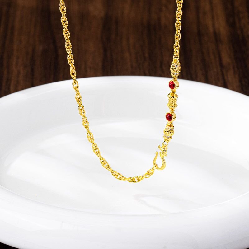 This exquisite Golden Elegance Necklace is crafted from high-quality gold, featuring a delicate chain design that offers both strength and beauty. The necklace is enhanced with carefully placed red gemstones, which add a vibrant pop of color to the overall golden shine. Perfect for formal occasions or adding a touch of sophistication to everyday wear, this piece will surely become a timeless addition to your jewelry collection. Whether worn alone or layered with other pieces, its classic charm makes it a versatile accessory.