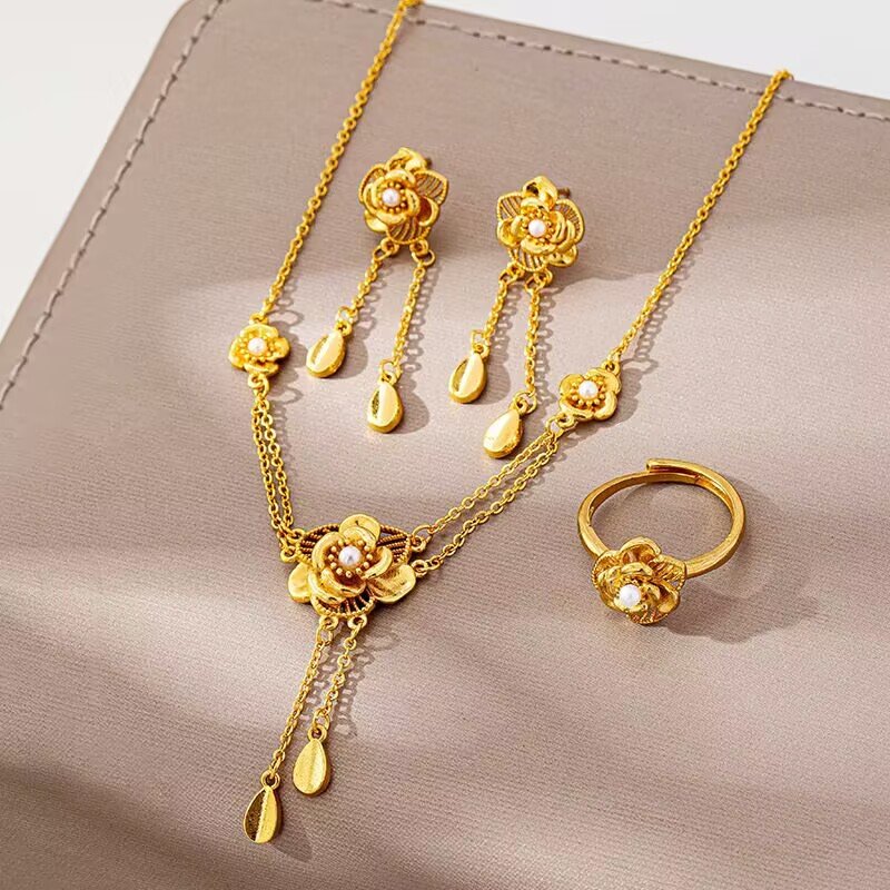 The Golden Blossom Jewelry Set is a beautiful collection that includes a necklace, earrings, and a ring, all featuring intricate floral designs. Each flower is adorned with a lustrous pearl at its center, surrounded by golden petals and delicate drops, creating a harmonious and graceful effect. The set is crafted in high-quality gold, ensuring both luxury and durability. Perfect for formal events, romantic occasions, or adding a touch of elegance to daily wear, this set brings a timeless, feminine beauty to any look. The Golden Blossom Jewelry Set is a perfect choice for those who appreciate refined details and exquisite craftsmanship.