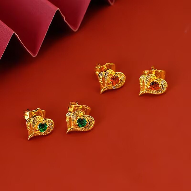 The Heart-Shaped Gemstone Stud Earrings are a perfect blend of romance and glamour. These earrings feature a charming heart-shaped design, crafted from high-quality gold and adorned with stunning gemstones. The earrings showcase vibrant green and orange stones, surrounded by sparkling accents that add extra sparkle. With their elegant yet playful design, these earrings are perfect for both casual and formal occasions, bringing a touch of color and sophistication to any look. Their timeless appeal and intricate detailing make them a must-have accessory for any jewelry collection.