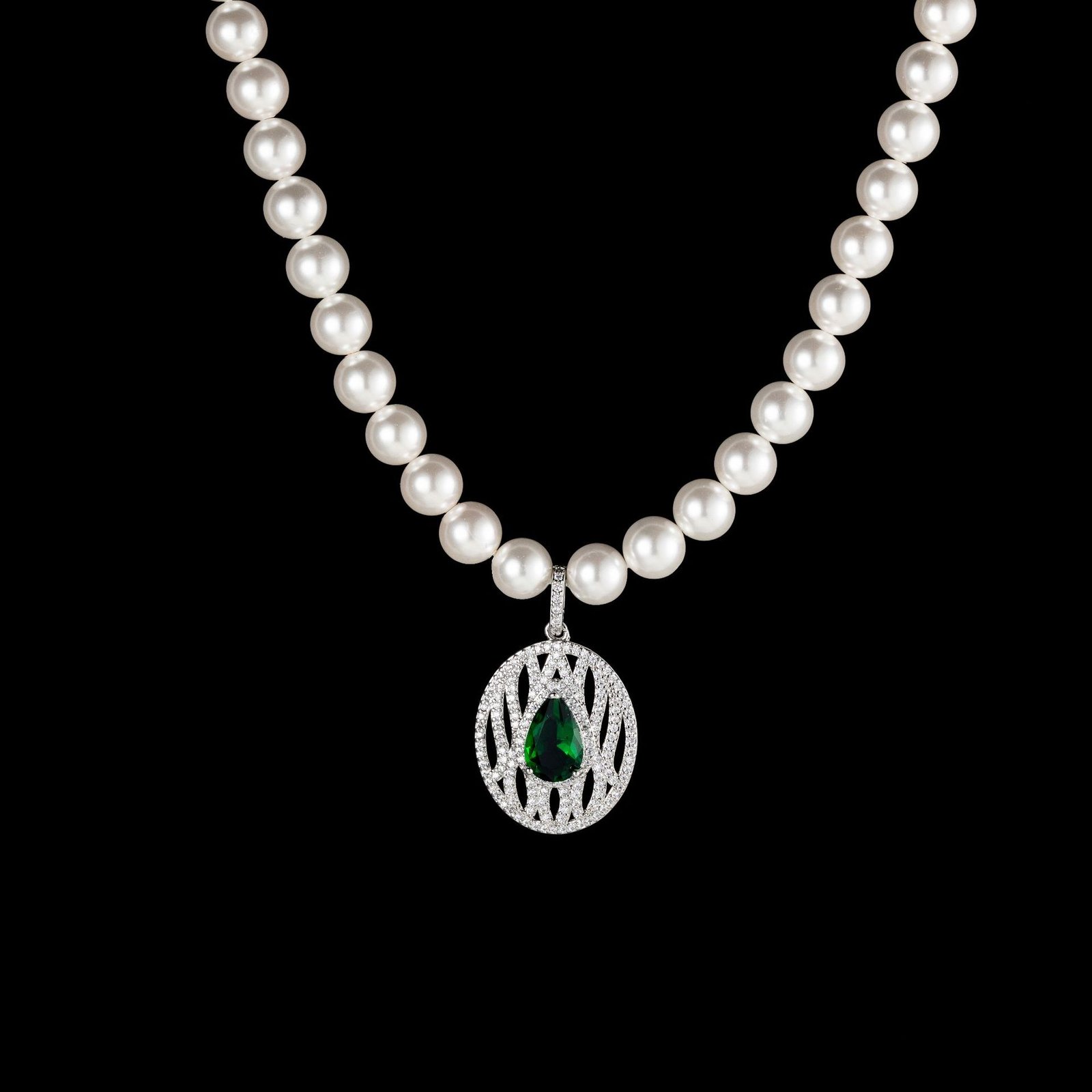 Crafted with a strand of luminous white pearls, this necklace features a striking emerald-green teardrop gemstone at its center. The pendant is delicately framed by an oval pavé setting of shimmering stones, creating a radiant contrast against the rich green centerpiece. The intricate openwork design adds dimension, lightness, and an air of timeless elegance.