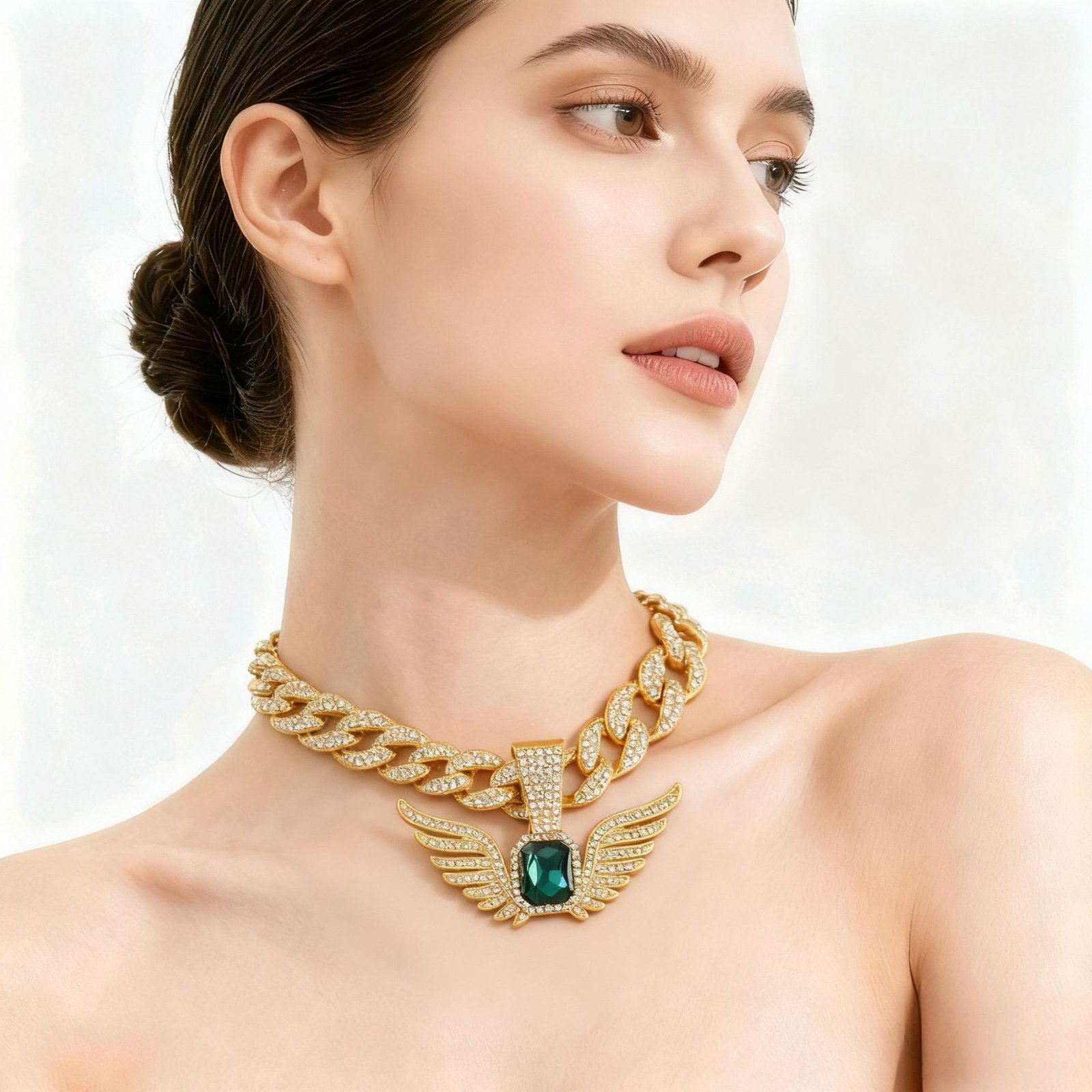 This striking necklace features a thick, high-polish gold chain paired with a meticulously detailed winged pendant. At its center rests a deep emerald-green stone, framed by shimmering pavé accents that catch the light from every angle. The wing motif represents strength, protection, and ascension — a symbol of rising above limits.