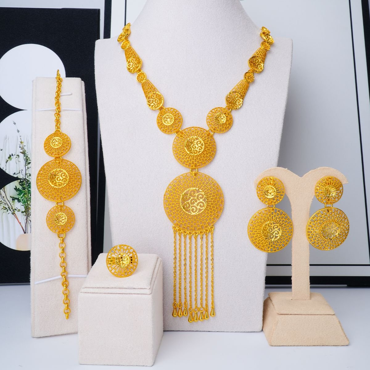 This set features intricately designed filigree patterns on a necklace, earrings, bracelet, and ring, all crafted in stunning gold plating. The necklace features a long, elegant drop with detailed circular elements that flow gracefully along the chain. The earrings and bracelet complement the necklace with matching circular motifs, adding a touch of sophistication. The ring is designed to coordinate seamlessly with the other pieces, bringing the whole set together in a cohesive, luxurious look.
